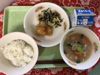 今日の給食は、『ごはん、いかのカリン揚げ、海苔和え、肉じゃが味噌汁』でした。