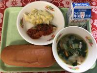 今日の給食は『コッペパン、レモンソースチキン、豆のスパイシー炒め、もち麦入りスープ』です。