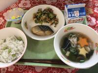 今日は『枝豆ご飯、鯖のカレー焼き、野菜のしそドレッシング和え、七夕汁、七夕ゼリー』でした。