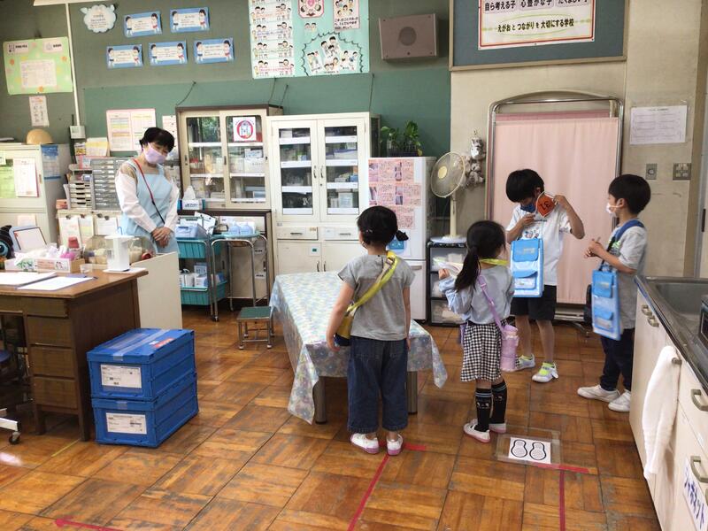 保健室に行って話を聞いたり、給食室をのぞいて手を振ったりと、学校のことがよ~くわかる1日でした。