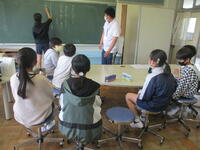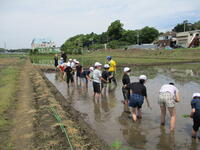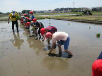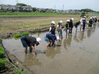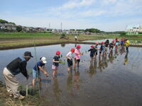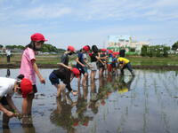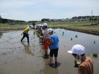 5年生は、今日総合的な学習の時間で、田植え体験をしてきました。藍川さんという農家の方やボランティアの方に指導していただきました。子供たちは裸足で田んぼに入り、一束一束稲を泥の中にさしていきました。感想発表では、「想像していたよりも楽しかった。」という声を聞くことができました。田植えは機械で行われますが、手植えの良さを感じたようです。藍川さんには、たくさんのお米についての質問もし、これからの活動への意欲を高める機会となりました。