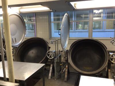 夕方、給食の先生と一緒に誰もいない給食室へ行ってみると…? 市教育委員会の方々のご協力で、奥の部屋の棚や扉が新しくなりました。ありがとうございました。隣の写真は大きなお釜。これは新しいわけではありませんが、お釜の向こうに廊下が見えます。廊下からも、調理員の方々が一生懸命作業しているところが見えます。子供たちは時々手を振ったりして、その日の給食を楽しみにしています。そんな光景を見ている職員たちも、朗らかな笑顔です。