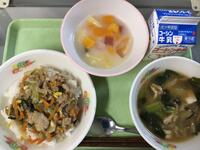 今日の給食は「豚の生姜焼き丼、じゃがいものお味噌汁、ホワイトポンチ、牛乳』です。