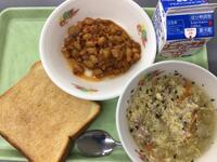 今日の給食は『シナモントースト、チリコンカン、ふわふわ卵のバジルスープ』牛乳です。