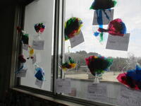 1年生の廊下には、図工の作品が貼られています。窓の光を通して、セロファンの色が透けて、色鮮やかな窓に変身しています。