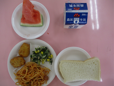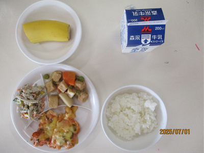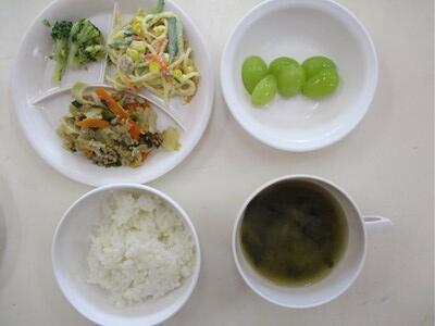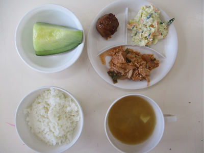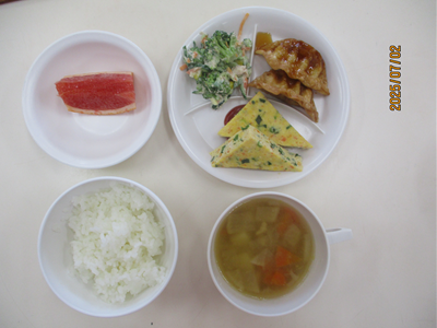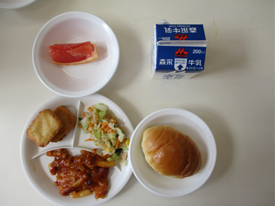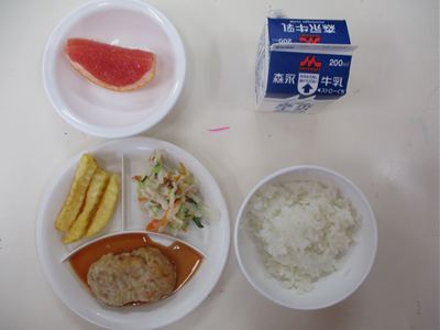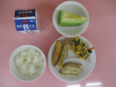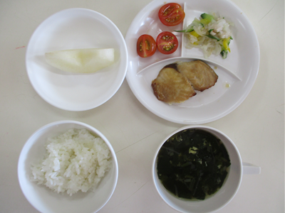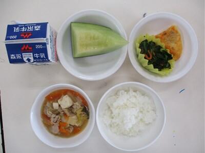 ごはん 肉豆腐 おかか和え ミートオムレツ 牛乳 メロン