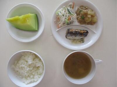 ごはん さんまレモン煮 じゃがいものそぼろ煮 シルバーサラダ なめこ汁 メロン