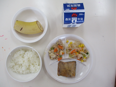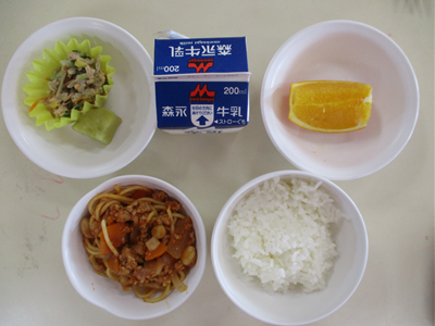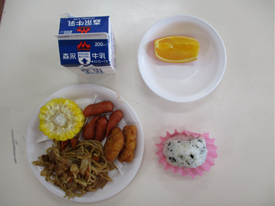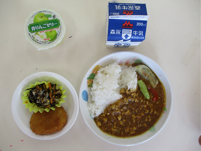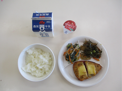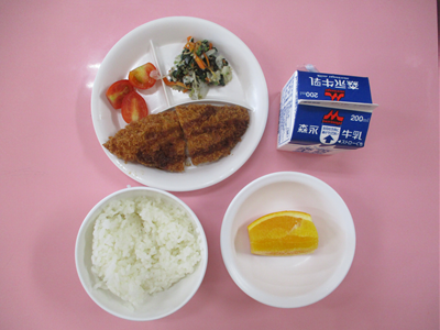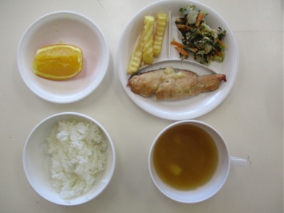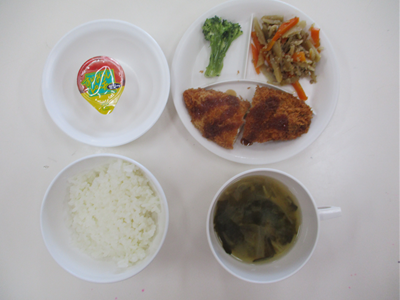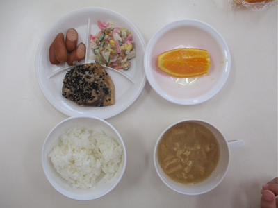 給食のメニューには、かぼちゃコロッケにかぼちゃ型のかまぼこ!(スープに入ってました)