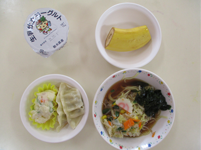 きのこうどん とり天 小松菜のごまマヨ和え チーズ バナナ