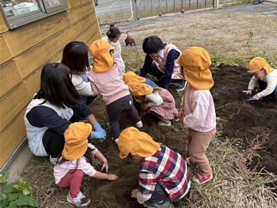 今日は、りんご組さんみんなで園の畑でおいもほりをしましたおいもはどこにあるかな