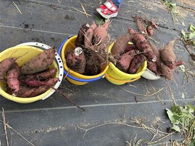 掘ったり、つたを引っ張ったりしたことで手の汚れがなかなか落ちず、汚れた服も持って帰ると思います。お子さんとお風呂でおいもほりの楽しかったお話をしながら洗ってあげてください。よろしくお願いします