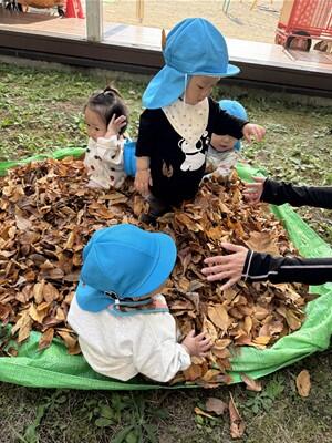 先日、まほろば周辺のお散歩に行った時に集めてきた落ち葉を使って、乳児さんの中庭で遊びました
