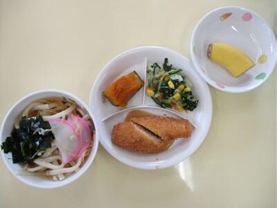 ・けんちんうどん ・さつまいもの甘煮 ・卵サラダ ・ウインナー ・バナナ