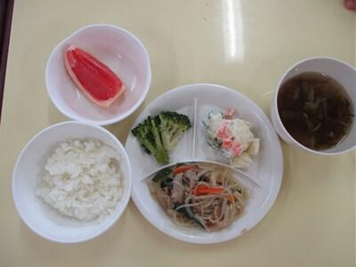 ・ごはん ・チャプチェ ・インディアンサラダ ・ブロッコリー ・グレープフルーツ ・もずくスープ