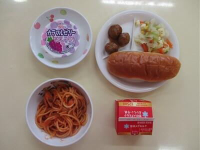 ・コッペパン ・ナポリタン ・チーズサラダ ・ミートボール ・ブドウゼリー ・牛乳