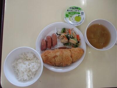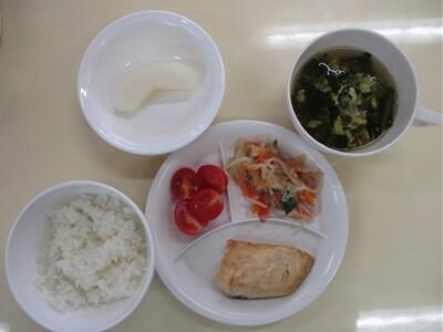 ・ごはん ・鮭フライ ・キャベツとひじきの和風サラダ ・ミニトマト ・りんご ・みそ汁