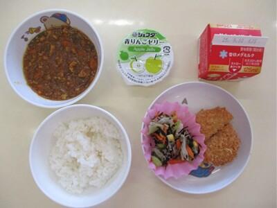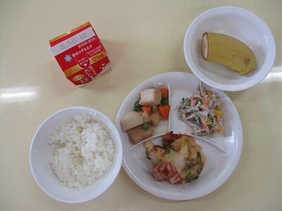 ・ごはん ・ポークカレー ・チキンナゲット ・春雨の酢の物 ・バナナ ・牛乳