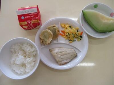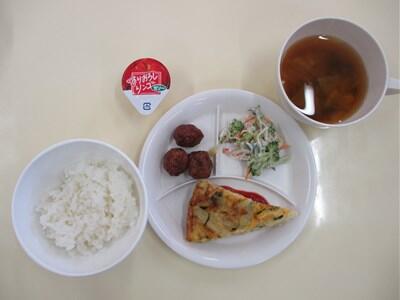 ・ごはん ・モロフライ ・かんぴょうサラダ ・ミニトマト ・県民の日ゼリー ・かき玉汁