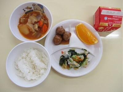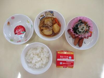 ・ごはん ・すき焼き風煮 ・マカロニサラダ ・ミートボール ・柿 ・牛乳