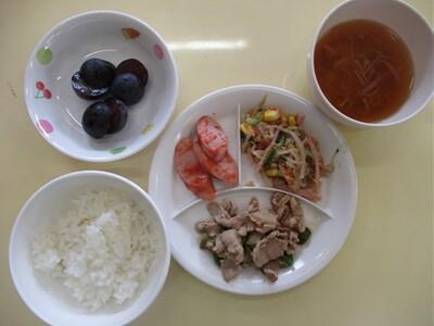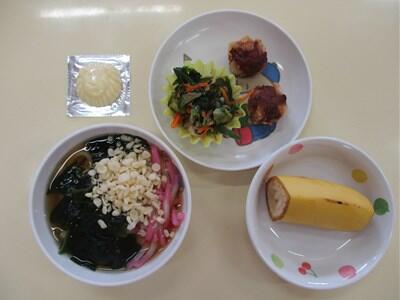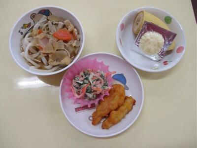 ・わかめうどん ・ささみチーズフライ ・中華和え ・かぼちゃの甘煮 ・バナナ