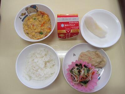 ・ごはん ・麻婆豆腐 ・厚焼き玉子 ・五色和え ・バナナ ・牛乳