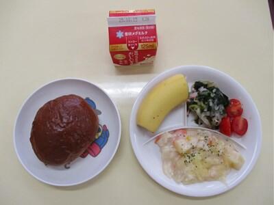 ・バターロール ・焼きそば ・さつまいもサラダ ・ウインナー ・バナナ ・牛乳