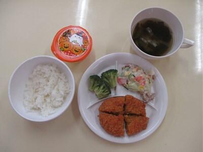 ・ごはん ・かぼちゃコロッケ ・納豆サラダ ・ブロッコリー ・ハロウィンババロア ・わかめスープ