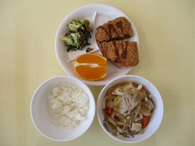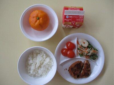 ・ごはん ・豚カツ ・ごま和え ・ミニトマト ・みかん ・牛乳