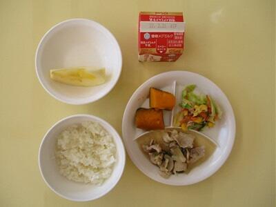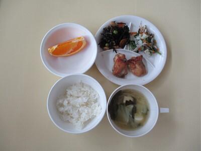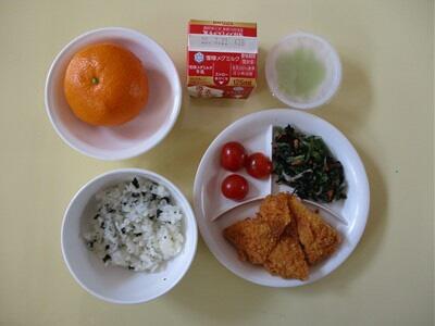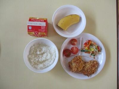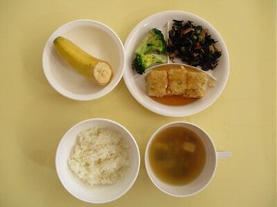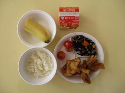 ・ごはん ・鶏肉のかりん揚げ ・ひじきの煮物 ・ミニトマト ・バナナ ・牛乳