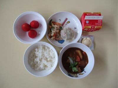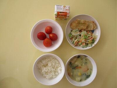 ・ごはん ・クリームシチュー ・豆腐ナゲット ・キャベツサラダ ・いちご ・野菜ジュース