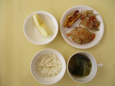 ・ごはん ・豆腐ハンバーグ ・根菜のきんぴら ・おさつフライ ・りんご ・味噌汁