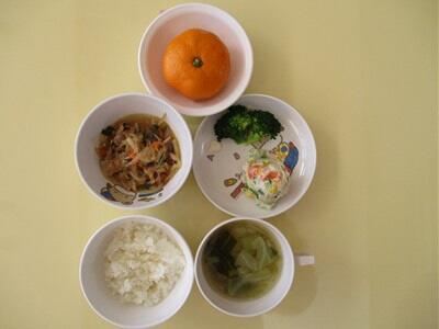 ・ごはん ・さばのみそ煮 ・金平ごぼう ・ブロッコリー ・オレンジ ・みそ汁