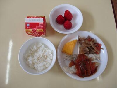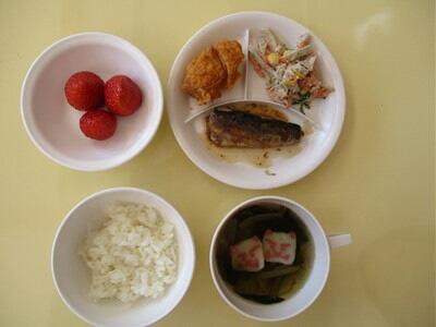 ・ごはん ・いわしのおかか煮 ・ごぼうサラダ ・ソーセージフライ ・いちご ・すまし汁