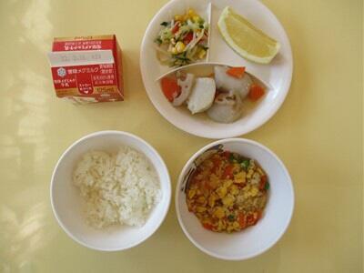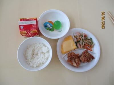 ・ごはん ・油淋鶏 ・チーズオムレツ ・彩り和え ・ミニゼリー ・牛乳