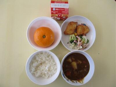 ・ごはん ・ポークカレー ・花野菜サラダ ・ナゲット ・みかん ・牛乳