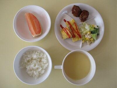 ・ごはん ・ピザ風玉子焼き ・カリフラワーサラダ ・ミートボール ・グレープフルーツ ・コーンスープ