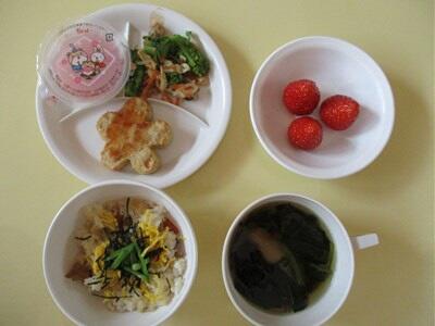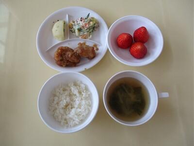 ・ごはん ・鶏肉のから揚げ ・ポテトサラダ ・ミニトマト ・いちご ・コンソメスープ