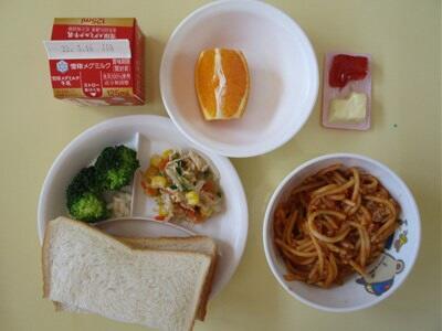 ・食パン ・ミートスパゲティ ・バンバンジーサラダ ・ブロッコリー ・オレンジ ・牛乳 ・ジャム