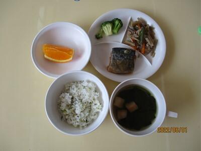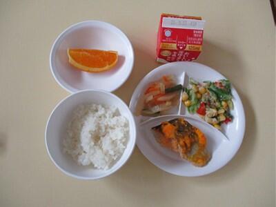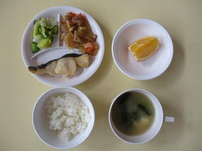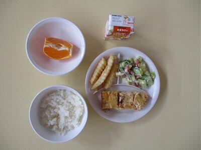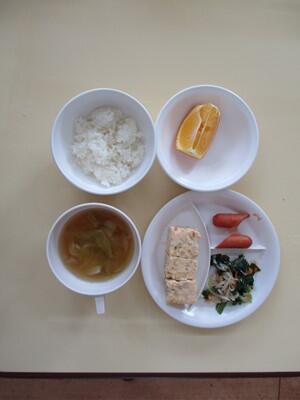 ・ごはん ・白身魚のあけぼの焼き ・大根のきんぴら ・和風サラダ ・オレンジ ・牛乳