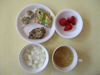・ごはん ・もろのごま焼き ・納豆サラダ ・しゅうまい ・いちご ・みそ汁