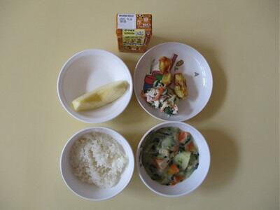 ・ごはん ・クリームシチュー ・ブロッコリーサラダ ・ちくわのカレー揚げ ・りんご ・麦茶