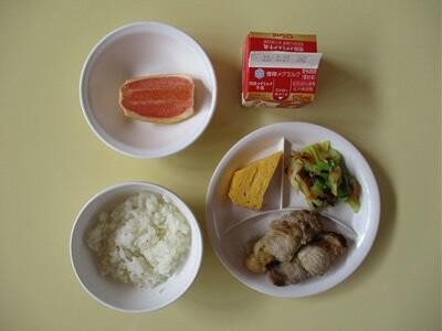 ・ごはん ・豚肉のBBQソース ・塩昆布あえ ・厚焼き玉子 ・グレープフルーツ ・牛乳