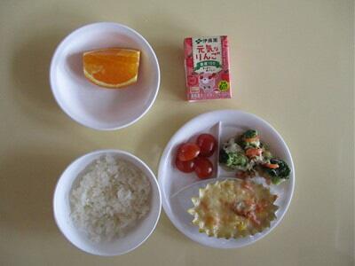 ・ごはん ・ポテトグラタン ・ツナ和え ・ミニトマト ・オレンジ ・リンゴジュース