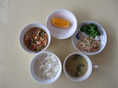 ・ごはん・マーボー豆腐・バンサンスー・ブロッコリー・オレンジ・中華スープ