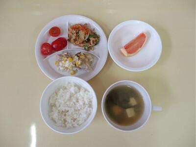 ・ごはん・鶏肉のコーンマヨ焼き・こぎつねサラダ・ミニトマト・グレープフルーツ・味噌汁