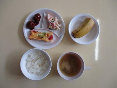 ・ごはん・野菜たっぷりキッシュ・ミートボール・マカロニサラダ・バナナ・味噌汁