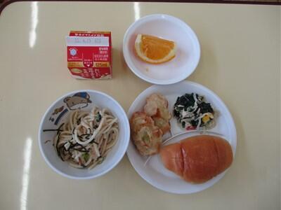 ・バターロール・和風ツナスパゲティ・チキンサラダ・豆腐ナゲット・はっさく・牛乳