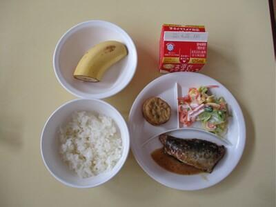 ・ごはん・いわしのごまみそ煮・キャベツサラダ・がんも煮・バナナ・牛乳