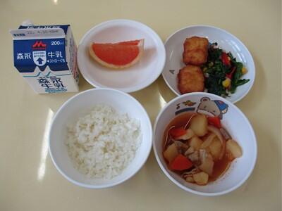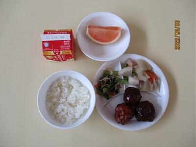 ・ごはん ・ミートボール ・根菜の煮物 ・お浸し ・グレープフルーツ ・牛乳