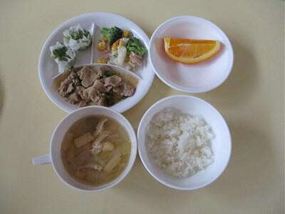 ・ごはん ・焼肉 ・キャベツサラダ ・里芋の土佐煮 ・いよかん ・みそ汁